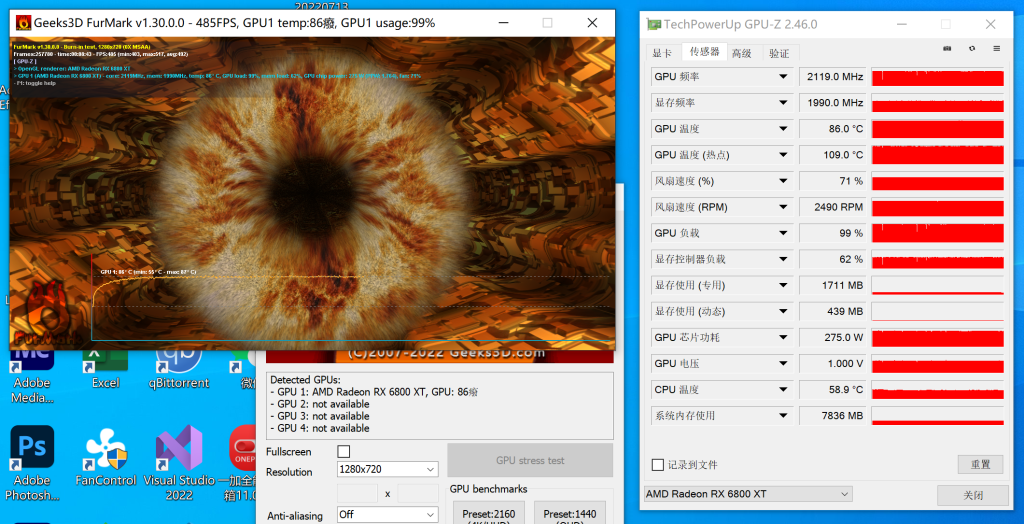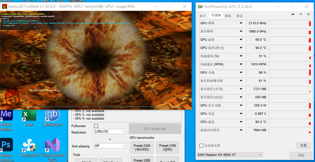 默认720P拷机Furmark,492fps 功耗255w,这个是核心功耗,显存功耗还需要加上45w。