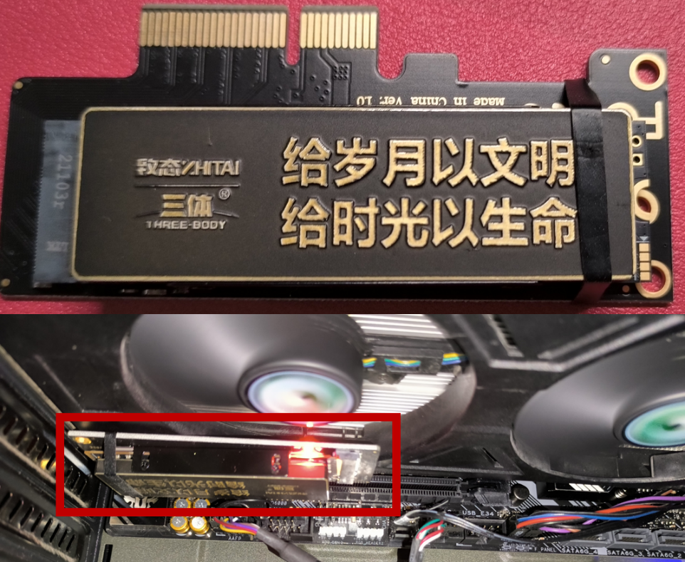 上机测试,测试平台TUF B550M-Plus配R5 5600X,内存为双通道DDR4 3200MHz。硬盘装进散热片后,使用转接卡插进主板的PCIE槽内。图示为一开始的插法,后发现第二条插槽为PCIe3.0,所以拔掉显卡使用显卡插槽测试(直通CPU)。