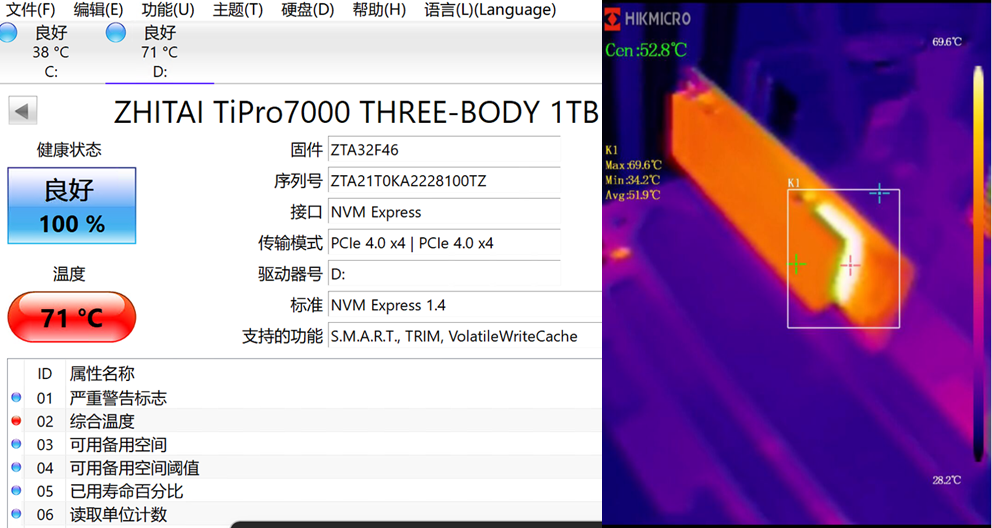 跑分结束趁热看一下硬盘温度表现和热成像结果。好家伙,Diskinfo里终于可以正确识别盘体温度了,相比第一版固件的恒定65℃有了实质的区别。但是这温度还是比较吓人,1GB/轮的跑分测试已经达到了71℃的高温,机箱内风道良好还没有显卡压制,实际使用的温度还是堪忧。红外相机下只能捕捉到盘尾颗粒的温度,最高点也达到了69.6℃,说明全盘都有极高的散热压力。此时再看官方的工作温度范围(0-70℃),有点好笑。