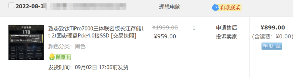 最后推荐帮我售后的良心老板,淘宝店铺——理想电脑。他家固态一般都会给优惠和赠品。这块固态我已810包邮挂上闲鱼,没有有缘人我就捡垃圾装二奶了。