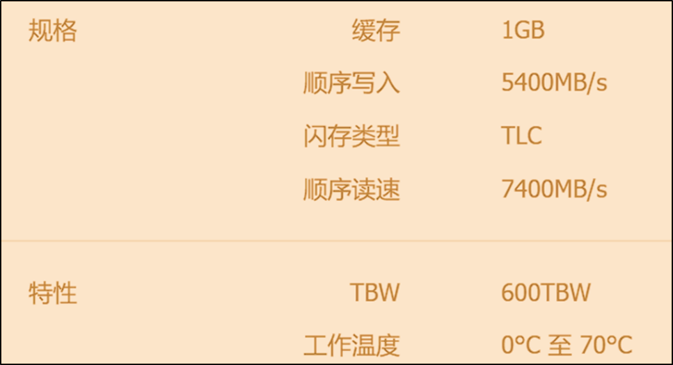 首先看看官方标称规格,顺序读取速度7400MB/s,写入5400MB/s,保修5年,寿命600TBW,与第一版和普通版别无二致。