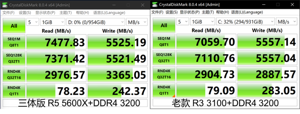 CDM测试结果如下,因为测试平台与半年前有区别,所以顺序读取速度远超上次测试结果(竟然超过了官方标称的7400MB/s),4K读取速度依旧在78-79MB/s,略逊于三星9A1。