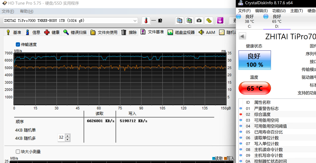 姑且认为这块盘的温控策略不会导致暴毙(我也不敢再测了),继续进行缓内缓外连续读写测试。150GB的文件基准测试完全跑不出SLC的范围,读6600MB/s和写5200MB/s会是这块盘日常轻载环境下的典型性能。