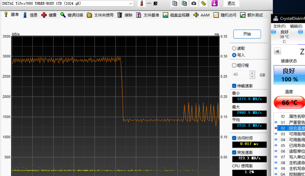 使用普通基准进行缓外测试,在写入半盘后速度陡降至1400MB/s,测试末尾触发了回收机制,曲线开始剧烈抖动。这个表现只能说还行,比不上1T版本的PM9A1(可惜颗粒报错),国产仍需努力。奇怪的是,此时温度竟然比CDM要低,仅66℃。