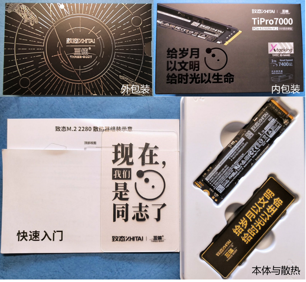 半年前曾测试致态PCIe 4.0的新品TiPro7000 1T版本,怎料固件有失水准导致高温暴毙,始末挂在B站专栏还被冷嘲热讽。在售后期间,TiPro7000京东下架回炉重造,上个月才重新放货,并且推出了三体联名版本。所以,我又割腰子买了一条回来玩玩。